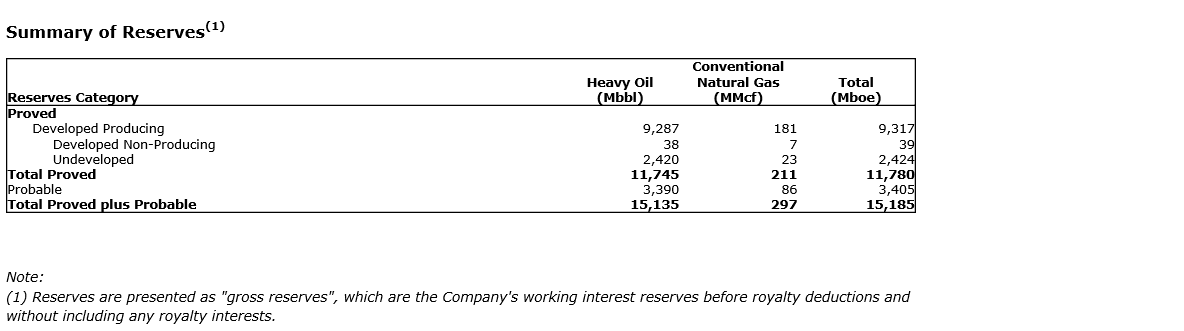 - Recognized reserve volumes of 15.2 mmboe (99.7 per cent heavy crude oil);
