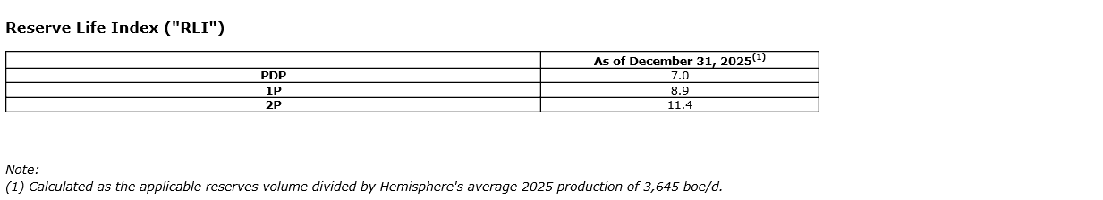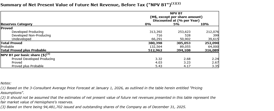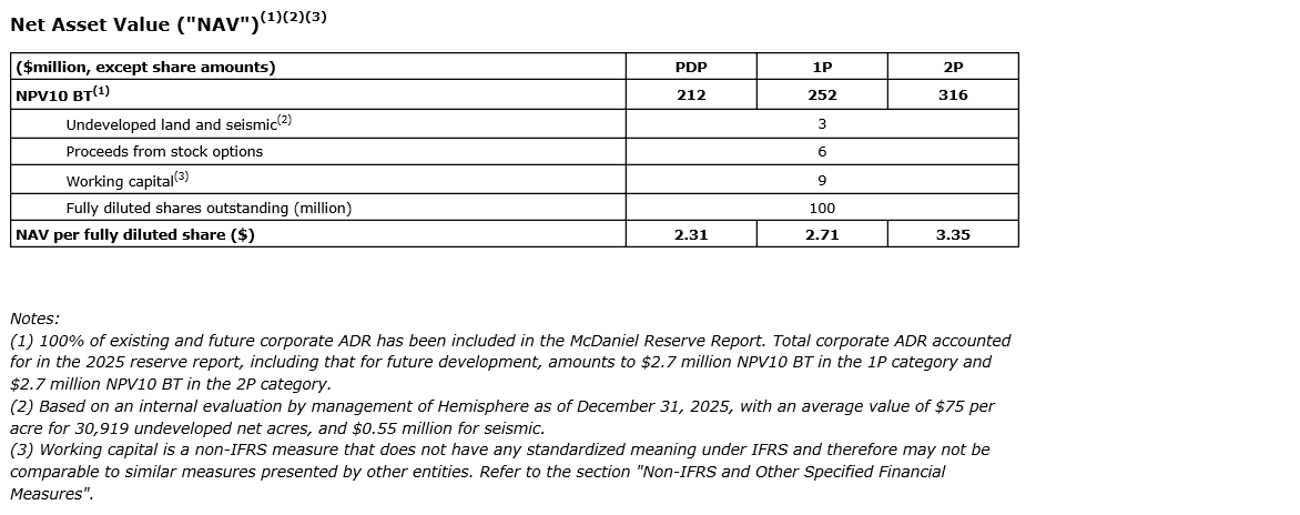 The reserves data set forth in this news release are based upon an independent reserves evaluation prepared by McDaniel dated March 10, 2026, with an effective date of Dec. 31, 2025, and is in accordance with definitions, standards and procedures contained within COGEH and National Instrument 51-101, Standards of Disclosure for Oil and Gas Activities. Additional reserve information as required under NI 51-101 will be included in Hemisphere's annual information form, which will be filed on SEDAR+ on or before April 30, 2026. Total values may not add due to rounding. All dollar values are in Canadian dollars, unless otherwise noted.