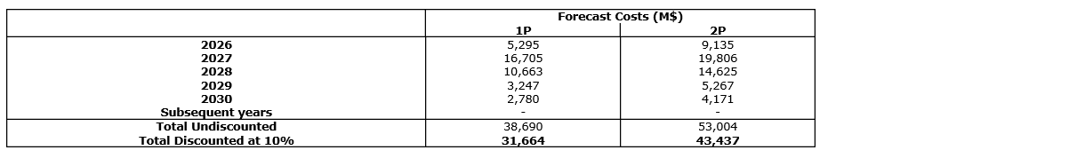 An attached table summarizes the development costs deducted in the estimation of the net present value of the future net revenue attributable to 1P and 2P reserves.