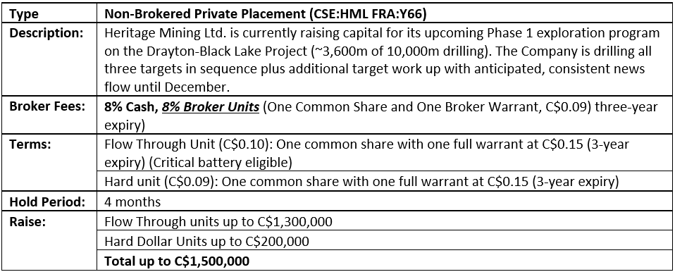 HERITAGE MINING ANNOUNCED EXPECTED CLOSING OF NON-BROKERED PRIVATE PLACEMENT OF UNITS AND FLOW-THROUGH UNITS AUGUST 18, 2023