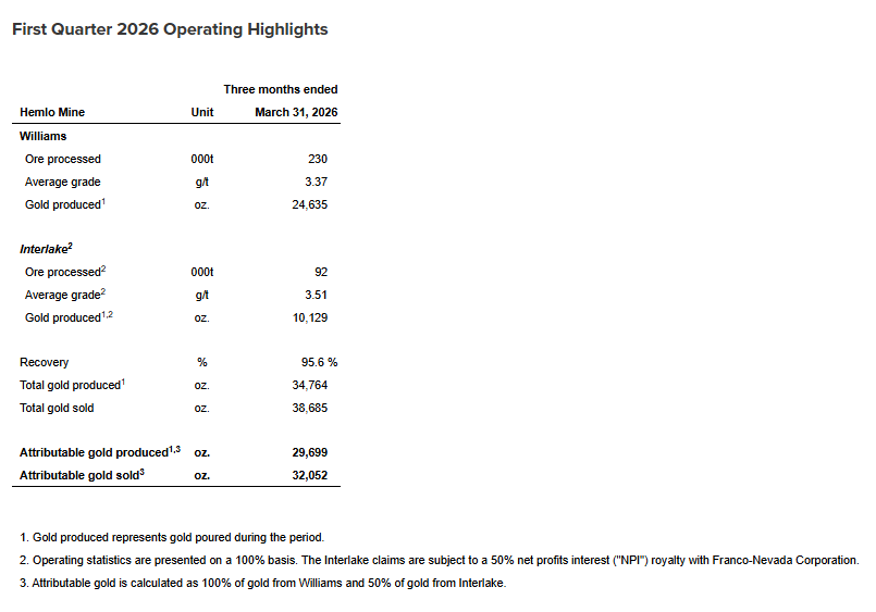 Hemlo Mining Corp. has released operating results for the first quarter ended March 31, 2026. The company plans to release its first quarter 2026 financial results after market close on Wednesday, May 20, 2026, followed by a conference call hosted by senior management on Thursday, May 21, 2026, at 9 a.m. Eastern Time.