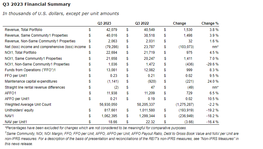 FFO was $13.1-million, or 23 cents per unit, for Q3 2023 compared with $12.1-million, or 21 cents per unit, for Q3 2022. The improvement was primarily the result of the higher NOI (net operating income) discussed herein as well as a decrease of $300,000 in finance costs (net of finance income primarily from interest rate swaps, excluding the loss on extinguishment of debt in the comparative period), partially offset by $300,000 additional general and administrative expenses.