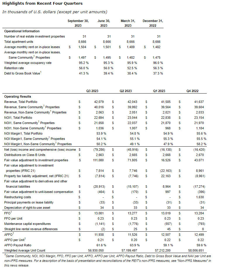- During Q3 2023, the REIT's AFFO payout ratio was 61.6 per cent compared with 67.2 per cent during Q3 2022;