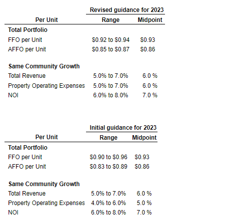 The REIT's 2023 guidance is outlined herein for FFO per unit and AFFO per unit, along with its expectations for same community properties for revenue, property operating expenses and NOI in 2023. The guidance does not include potential acquisitions, dispositions or future growth from the impact of properties currently under development.