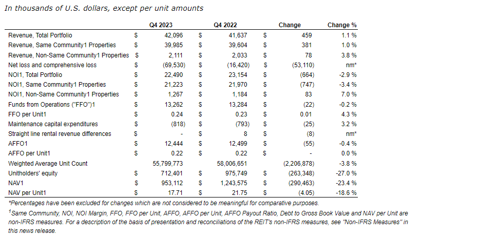 Total portfolio revenue of $42.1-million for Q4 2023 increased 1.1 per cent compared with $41.6-million in Q4 2022. Same community properties contributed $400,000 to the overall increase, as described herein.