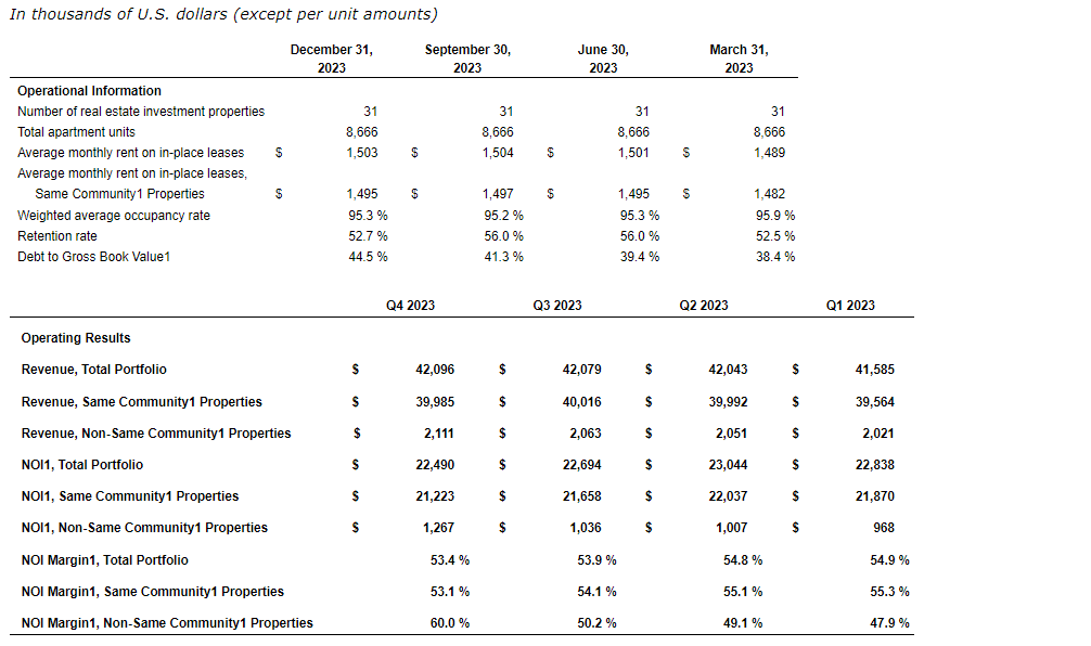 Revenue from same community properties of $40.0-million for Q4 2023 increased 1.0 per cent from $39.6-million in Q4 2022, primarily due to a 1.3-per-cent increase in average rental rates from $1,475 per apartment unit as of Dec. 31, 2022, to $1,495 per apartment unit as of Dec. 31, 2023.