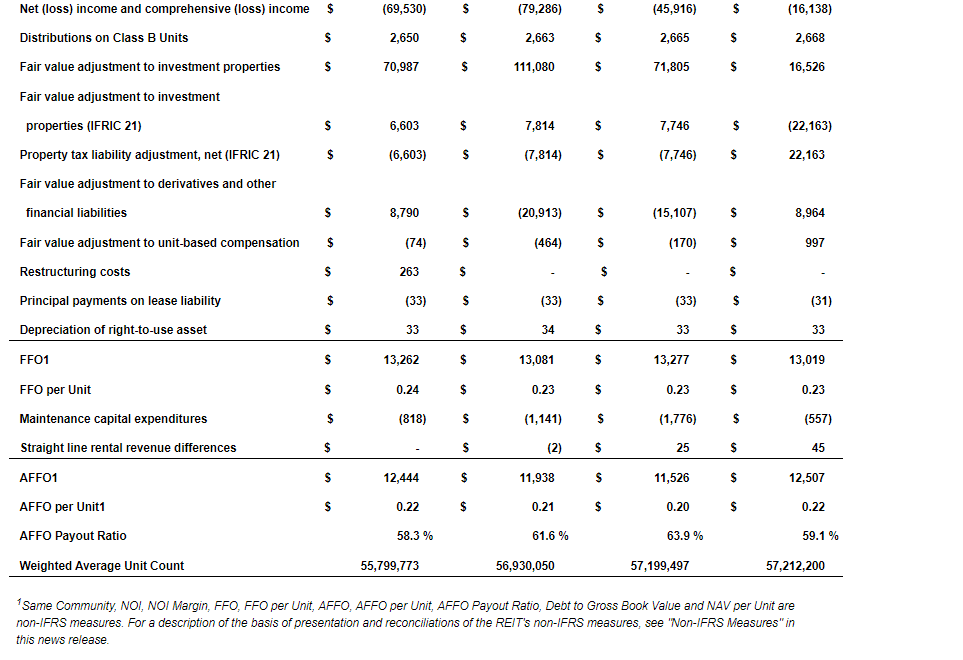 A reconciliation of funds from operations (FFO) and adjusted funds from operations (AFFO) to net income and comprehensive income, as well as an expanded discussion of the components of FFO and AFFO, and a reconciliation of net asset value (NAV) to unitholders equity can be found under "non-IFRS measures" in this release. FFO per unit, AFFO per unit and NAV per unit include trust units of the REIT, Class B units of BSR Trust LLC and issued deferred units.