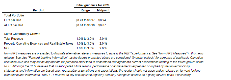 The REIT's 2024 guidance is outlined herein for FFO per unit and AFFO per unit, along with its expectations for growth in same community properties' revenue, operating expenses and NOI. The guidance does not include potential acquisitions, dispositions or future growth from the impact of properties currently under development.