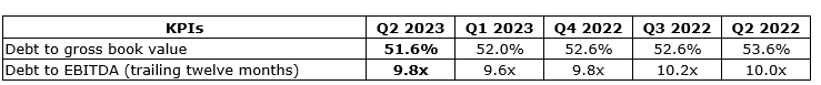 - Debt to gross book value (1) was 51.6 per cent as of June 30, 2023, decreases of 100 bps and 200 bps, respectively, compared with 52.6 per cent as of Dec. 31, 2022, and 53.6 per cent as of June 30, 2022.