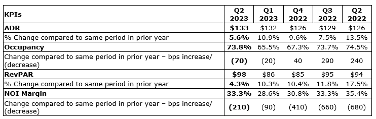 - Occupancy was 73.8 per cent for the second quarter of 2023, an increase of 100 basis points (bps) compared with 72.8 per cent for the same period of 2022.