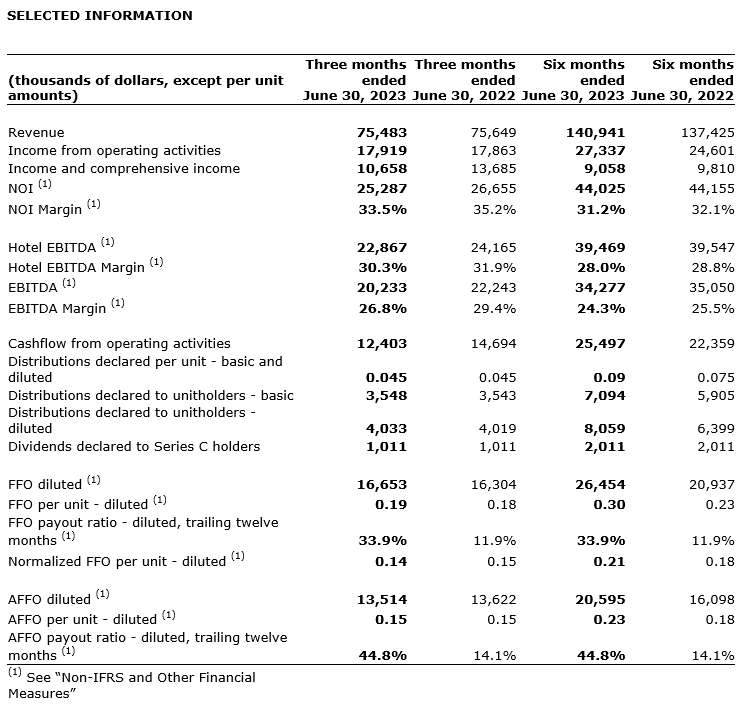 Diluted FFO per unit and normalized diluted FFO per unit were 19 cents and 14 cents for the second quarter of 2023, respectively, compared with 18 cents and 15 cents for the same period of 2022. The decrease in normalized diluted FFO per unit was primarily due to lower NOI in the current quarter. Normalized diluted FFO per unit in the current quarter excluded non-recurring insurance proceeds of $4.1-million for property damage related to the weather-related damage at several hotel properties in late December, 2022. For the same period in 2022, normalized diluted FFO per unit excluded a $2.3-million gain on debt settlement as well as $900,000 of other income that included a $700,000 government grant for the loss of revenue as a result of the COVID-19 pandemic.