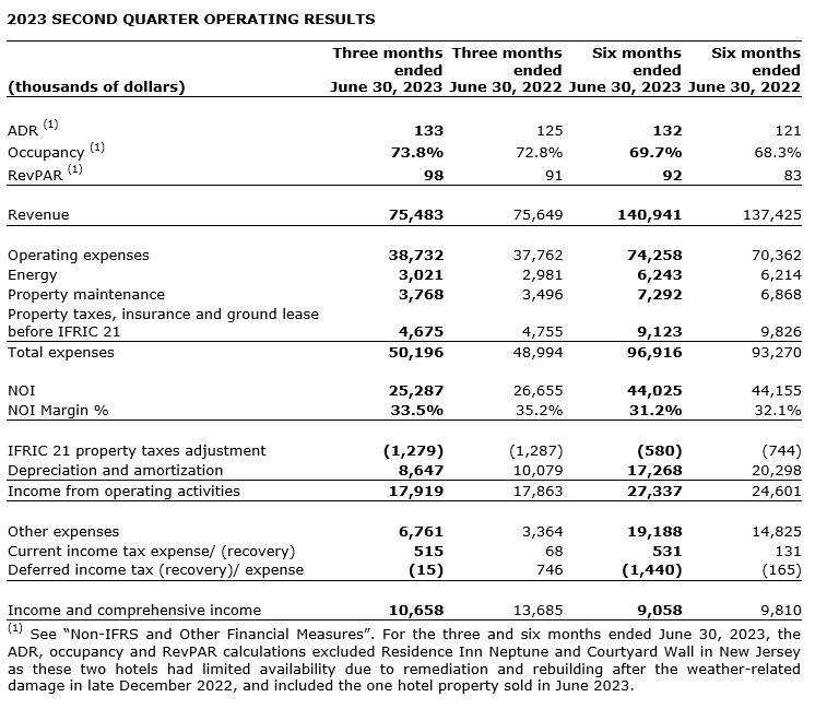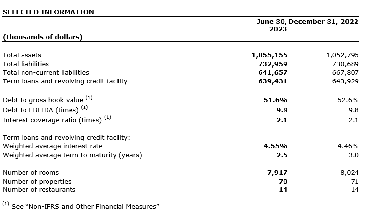 Mr. Korol continued: "Consistent with recent quarters, operating results were negatively impacted by inflation and labour shortages. We are continuing to focus on hiring more in-house labour, reducing turnover and improving housekeeping productivity to address these issues. However, progress is slow and labor costs will remain elevated into 2024. We are making steady progress on our leverage reduction with improvements over the last 12 months of 200 bps on debt to gross book value and 0.2 times on debt to EBITDA (1). We remain confident in our ability to navigate a dynamic operating environment and to add long-term unitholder value."