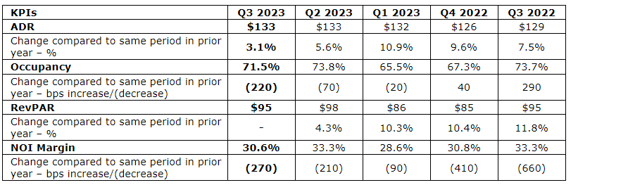 In Q3 2023, Q3 and Q4 2022, the same property ADR, occupancy and RevPAR calculations excluded the seven hotels sold in 2022 and the one hotel sold in 2023. The same property NOI margin calculation for the five most recent quarters excluded the seven hotels sold in 2022 and the one hotel sold in 2023.