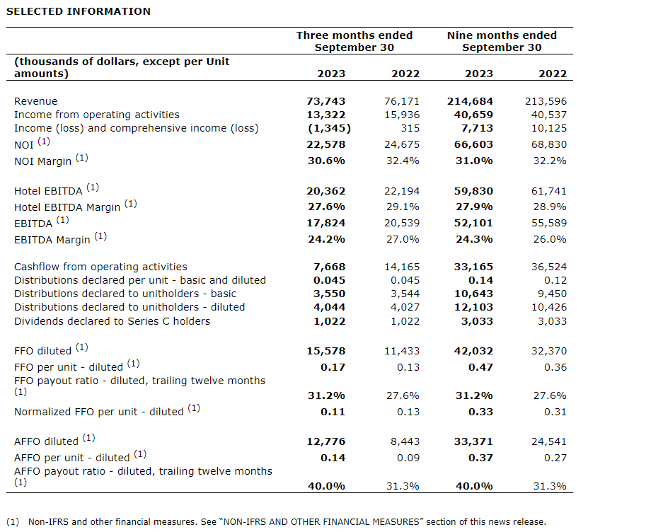 Diluted FFO per unit and normalized diluted FFO per unit were 17 cents and 11 cents for the third quarter of 2023, respectively, compared with diluted FFO per unit of 13 cents for the same period in 2022. Normalized diluted FFO per unit in the current quarter excluded non-recurring expected insurance proceeds of $5.4-million as a result of weather-related property damage at several hotel properties in late-December, 2022. The decrease in normalized diluted FFO per unit was primarily due to lower NOI in the current quarter.
