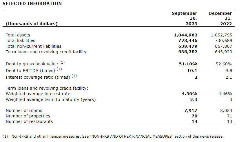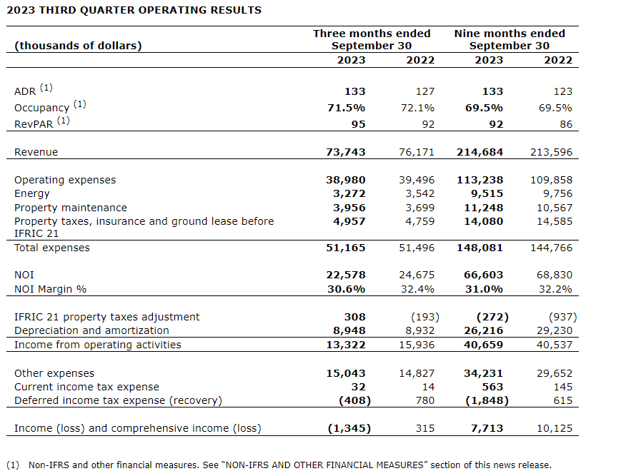 - NOI (net operating income) and normalized NOI were $22.6-million and $23.1-million, respectively, for the third quarter of 2023, decreases of 8.5 per cent and 6.5 per cent, respectively, compared with NOI of $24.7-million for the same period in 2022.