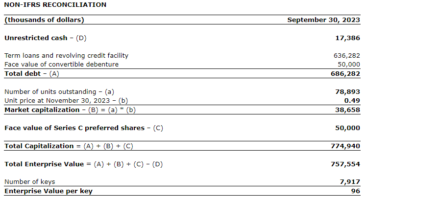 The appraised value of $286.2-million for the 20 borrowing base properties (2,070 keys) is equivalent to $138,000 per key, which is significantly higher than AHIP's enterprise value per key of $96,000, based on the United States-dollar closing price of 49 U.S. cents per unit on the Toronto Stock Exchange on Nov. 30, 2023.