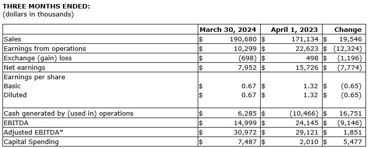 Adjusted EBITDA (earnings before interest, taxes, depreciation and amortization) of $30,972 in the quarter, or 16 per cent of sales; adjusted EBITDA is 6 per cent higher than the first quarter of 2023;