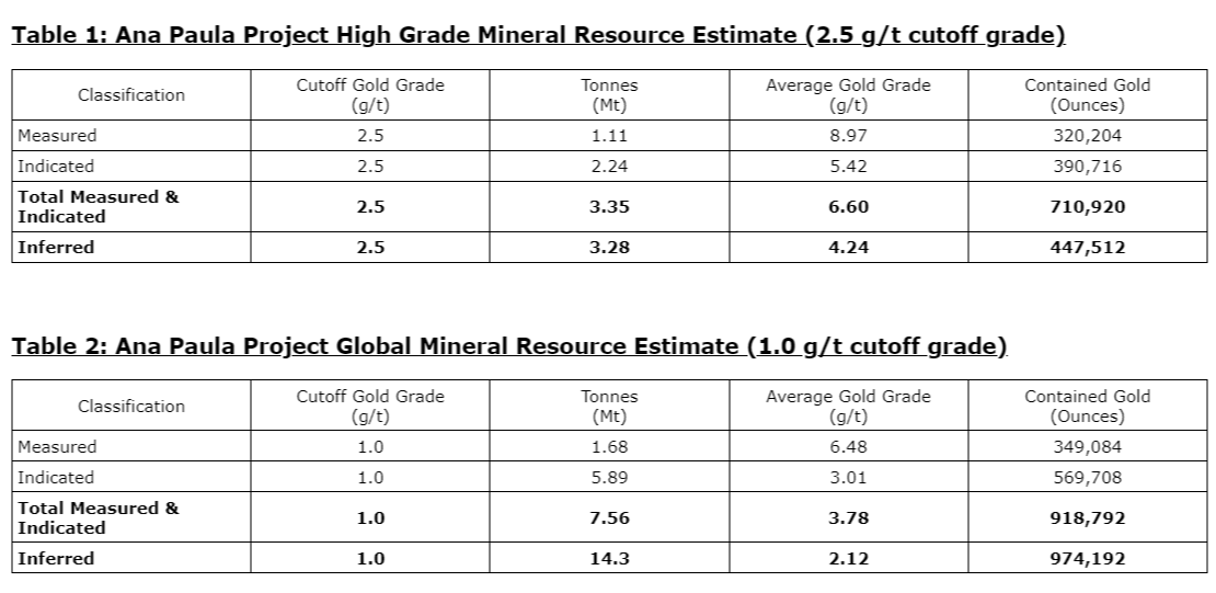 The high-grade portion of the Ana Paula deposit has grown significantly from 860,519 measured and indicated ounces of gold grading 4.86 g/t and 5,564 inferred ounces of gold grading 3.72 g/t to 710,920 measured and indicated ounces of gold grading 6.60 g/t and an additional 447,512 ounces inferred ounces of gold grading 4.24 g/t.