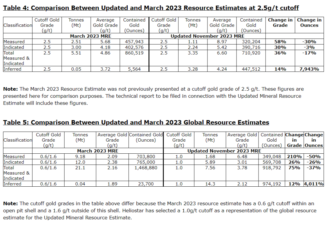 The Updated Mineral Resource Estimate has been designed and optimized for an underground mining scenario. The previous mineral resource estimate from March 2023 (the "March 2023 estimate") was designed and optimized for an open pit mining scenario with an underground component beneath the pit shell. The simplest comparison between these estimates is undertaken using the 2.5 g/t cutoff grade for both estimates (Table 4). A global comparison is shown for direct comparison with the previous total resource estimate (Table 5).