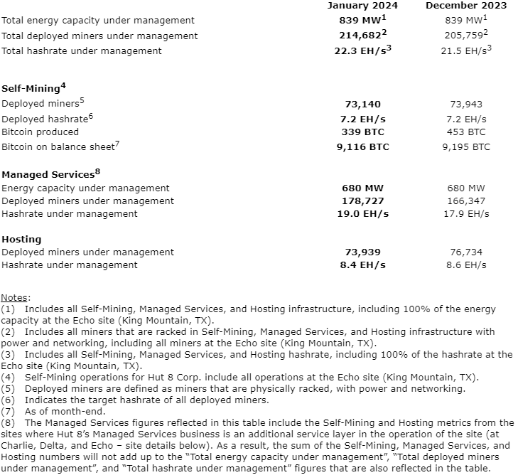 HUT 8 OPERATIONS UPDATE FOR JANUARY 2024