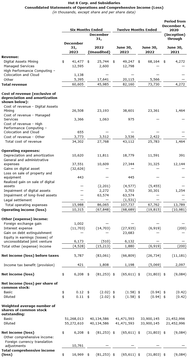 HUT 8 REPORTS OPERATING AND FINANCIAL RESULTS FOR THE SIX MONTHS ENDED DECEMBER 31, 2023