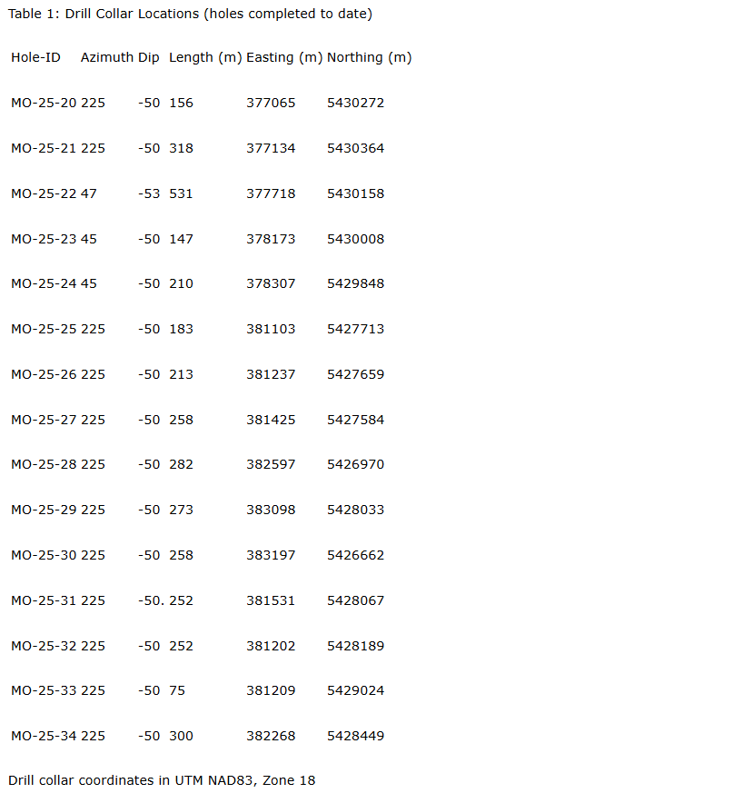 Highest grade assays from the second batch of five drill holes include 2.40 grams per tonne Au over 1.4 m (MO-25-21) and 1.26 g/t Au over 1.5 m (MO-25-20).