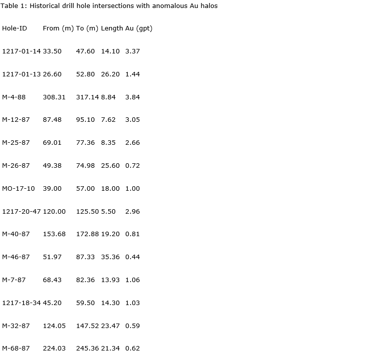 At the Morono gold deposit, several wide historical intersections -- locally extending up to 35.36 metres -- further illustrate the potential for extensive gold halo development. Selected historical intersections include: