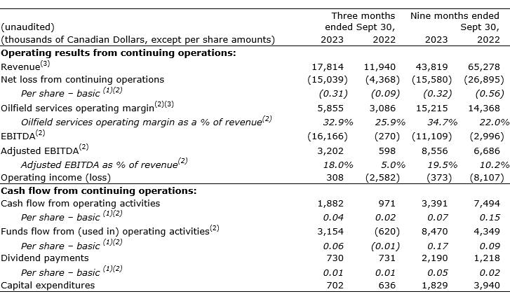 Revenue from continuing operations for the nine months of 2023 was $43,819, a decrease of $21,459 compared with the corresponding period of 2022 at $65,278. This decrease was due to the sale of Canadian well servicing and snubbing assets in 2022, which accounted for revenues of $36,099 for the nine months ended Sept. 30, 2022. Partially offsetting this decline was increased revenue from the drilling services segment of $13,108 as a result of steady drilling activity in PNG since Q1 2023. Revenue generated from the assets sold in the sale transactions during first half of 2022 totalled $36,099.