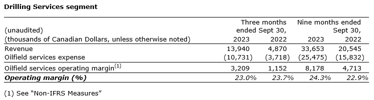 Oil field services operating margins improved as a percent of revenue from 22.0 per cent in Q3 2022 to 34.7 per cent in the nine months of 2023. This improvement is primarily a result of the strength in drilling services and ancillary services operating segments, and the results of the Canadian well servicing and snubbing assets impact on the 2022 production services segment results.