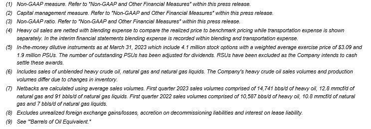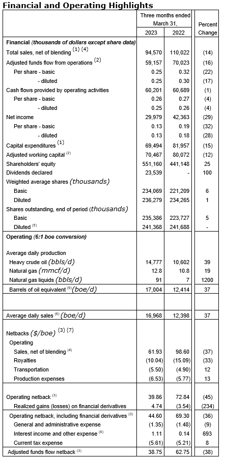Production averaged 17,004 barrels of oil equivalent per day (consisting of 14,777 barrels per day of heavy oil, 12.8 million cubic feet per day of natural gas and 91 bbl/d of natural gas liquids), representing an increase of 37 per cent from the first quarter of 2022;