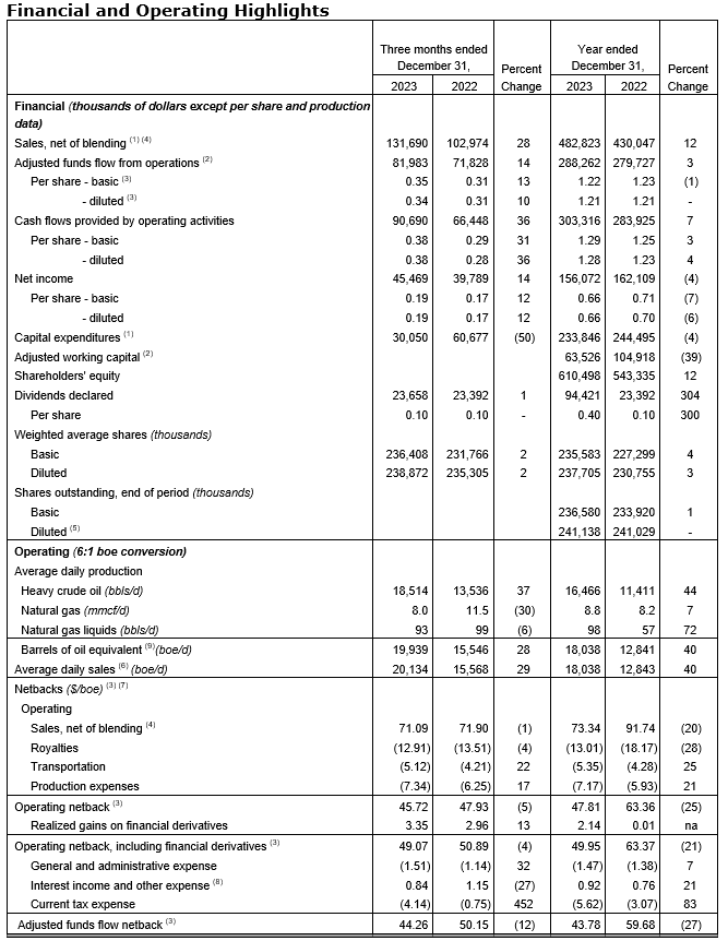 Achieved average production of 18,038 boe/d (91 per cent heavy oil), an increase of 40 per cent over 2022 annual production of 12,841 boe/d (89 per cent heavy oil);