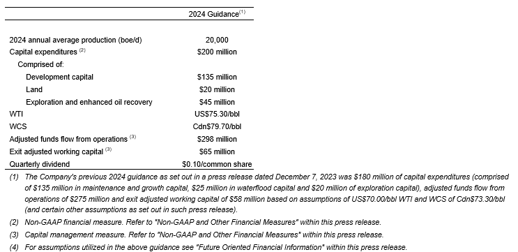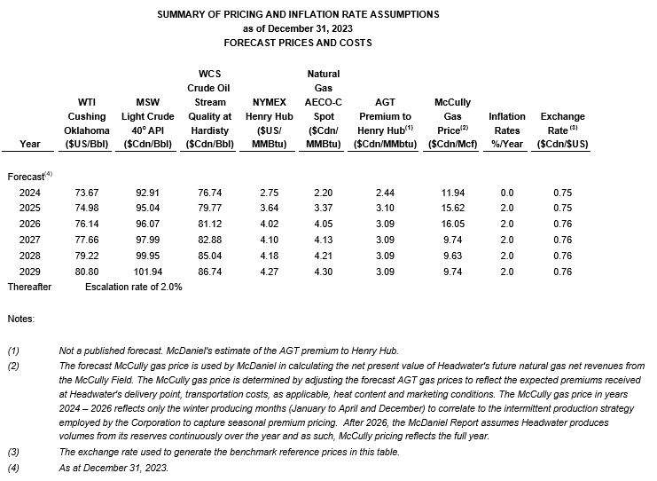 An attached table sets forth the benchmark reference prices, as at Dec. 31, 2023, reflected in the McDaniel report, using the average of commodity price forecasts from McDaniel, GLJ Ltd. and Sproule Associates Ltd., effective as at Jan. 1, 2024, to estimate the reserves volumes and associated values in the McDaniel report.
