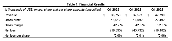 Revenue of $36.8-million, a sequential decrease of 2.2 per cent from Q4 2022 and a decrease of 14.1 per cent from the same quarter in the prior year;