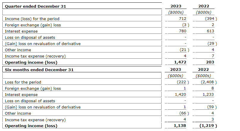- On a consolidated basis, IBC booked net income of $712,000 or one cent per share, as compared with a loss of $394,000 or (two cents) per share in the quarter ended Dec. 31, 2023. Consolidated adjusted earnings before interest, taxes, depreciation and amortization (adjusted EBITDA) rose to $1.9-million in the quarter, as compared with adjusted EBITDA in the comparable prior-year period of $673,000 and swung to positive adjusted EBITDA of $2.0-million in the six-month period ended Dec. 31, 2022, as compared with adjusted EBITDA of ($269,000) in the comparable prior-year period.
