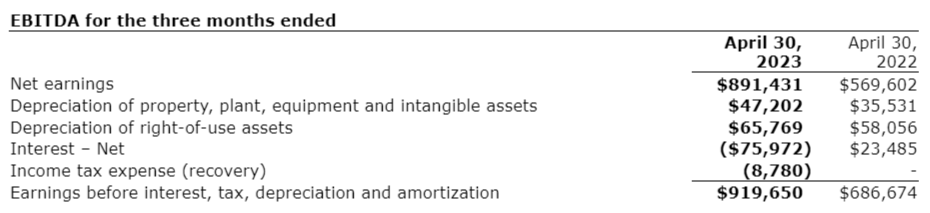 The company recorded EBITDA of $1,778,130, a decrease of $167,538 versus $1,945,668 in the same period a year ago, despite the slight increase in net earnings. The difference is attributed mainly to an increase in net interest of $226,242 due to higher interest income on the company's cash balances, which is excluded from EBITDA.