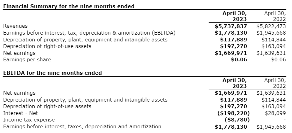 Revenues for the nine months ended April 30, 2023, totalled $5,737,837, a decrease of $84,636 as compared with $5,822,473 in the same period of the prior year, but 45 per cent higher than the same period in fiscal 2021.