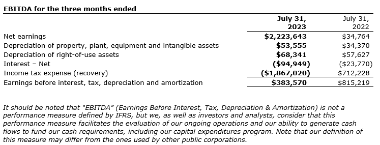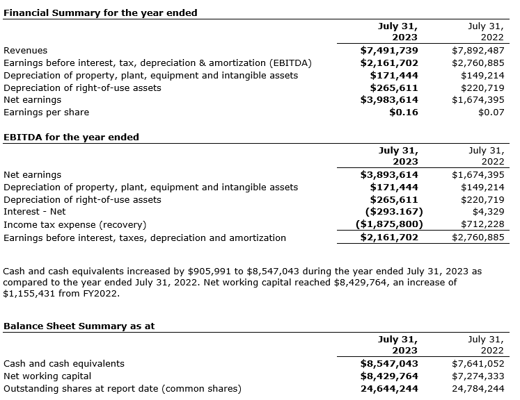 As mentioned above, the company recognized previously unrecognized tax assets, resulting in an income tax recovery for the year ended July 31, 2023. Due to this tax recovery, net earnings totalled $3,893,614, compared with net earnings in fiscal year 2022 of $1,674,395.