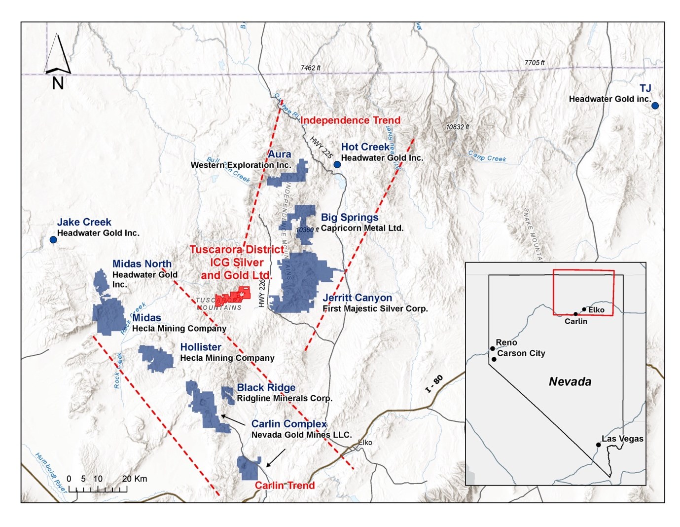 ICG Silver & Gold Ltd. is a new mineral exploration and development company advancing the Tuscarora District in northern Nevada. The Company's strategy is centered on:
