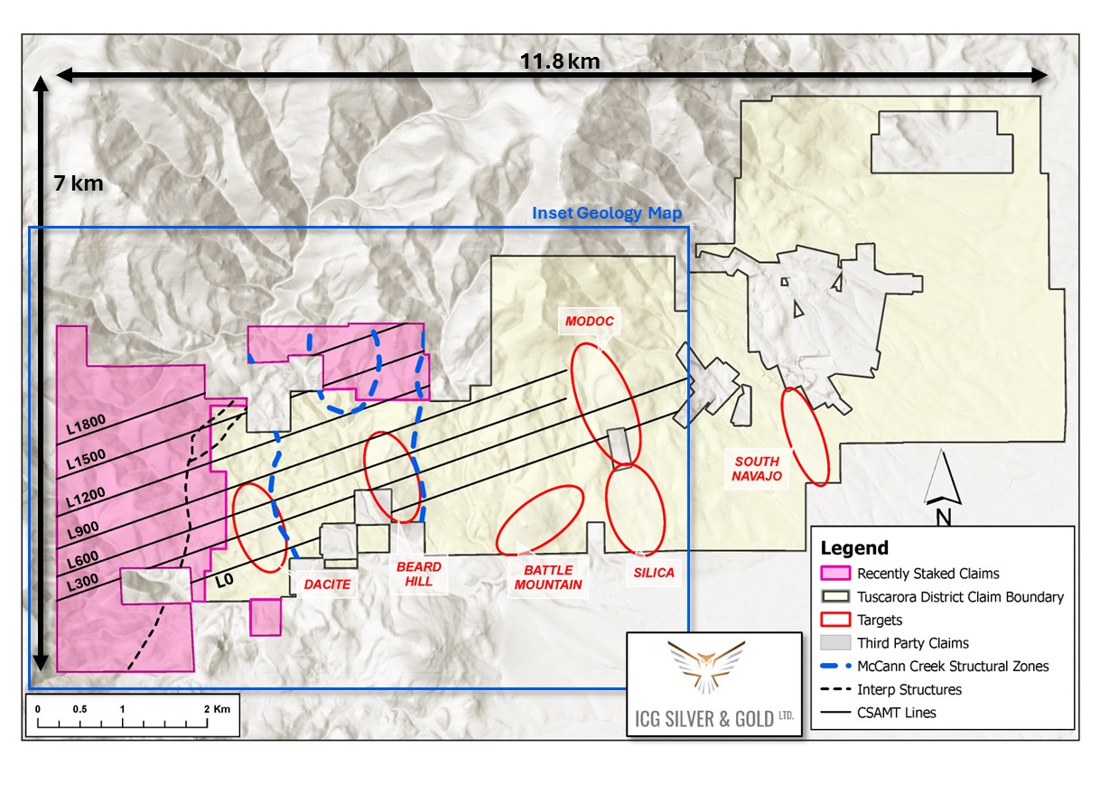 Toronto, Ontario--(Newsfile Corp. - April 16, 2026) - ICG Silver & Gold Ltd. (CSE: ICG) (FSE: JI0) ("ICG" or the "Company") is pleased to announce a significant expansion of the Tuscarora District ("Tuscarora", the "District", or the "Project") located in Elko County, Nevada, through the payment and staking of 104 additional unpatented mining claims on the western flank of the property (see Figure 1). The acquired claims cover approximately 2,000 acres of highly prospective ground and represent a strategic step toward consolidating the broader Tuscarora District. Given the growth in exploration and development activity in northern Nevada, as evidenced by First Majestic Silver Corp.'s planned restart of the Jerritt Canyon mine, which sits only 16 kilometers away from the Tuscarora District, ICG has made it a top priority to consolidate key claims.