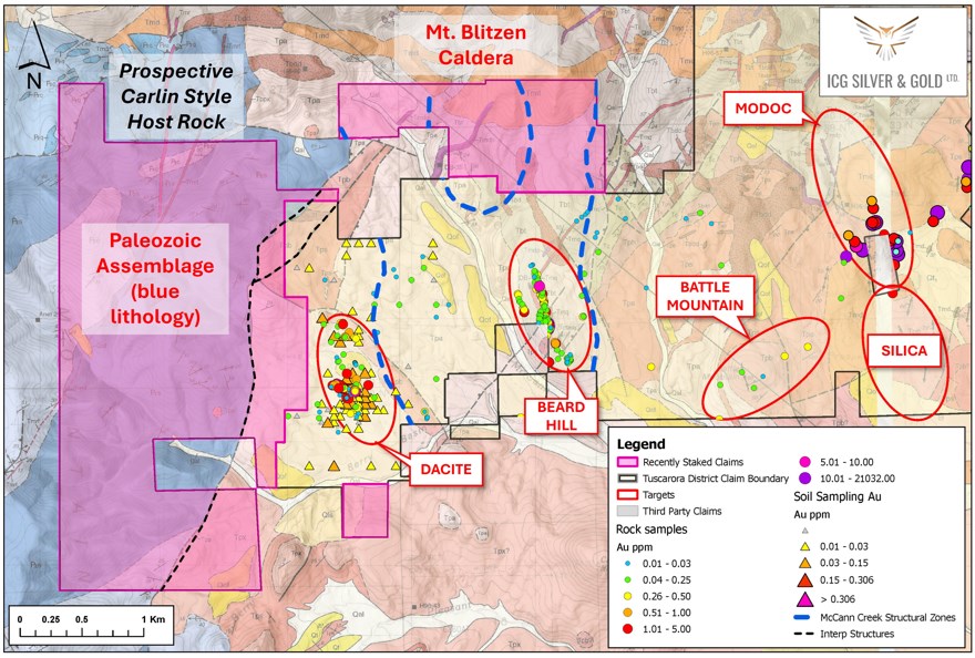 "The newly acquired claims reinforce the district-scale nature of the Tuscarora District, and highlight the prospectivity of the Beard Hill and Dacite targets," said Steven Sirbovan, President, CEO & Director of ICG Silver & Gold Ltd. "The addition of Carlin-style host rock on the western flank is a great complement to the layer cake of epithermal systems we are seeing on the central and eastern portions of our Project."