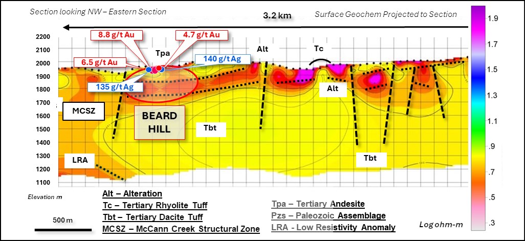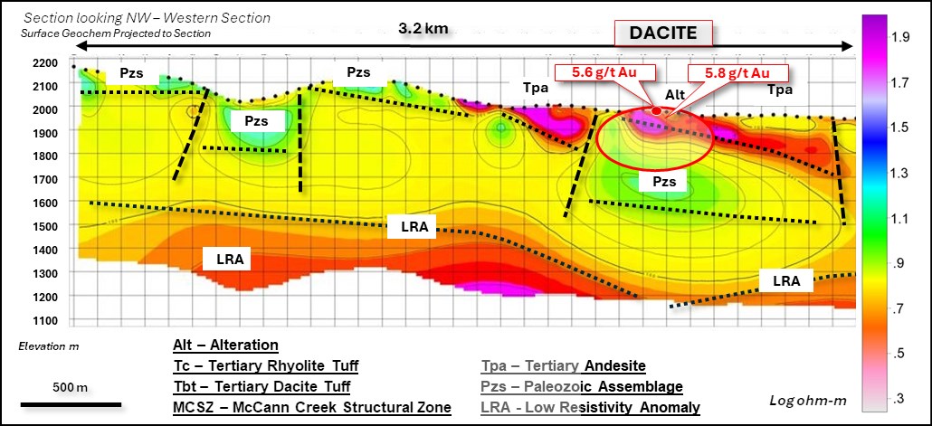 Recent integration of CSAMT data, historical mapping, and geological interpretation has significantly advanced the Company's understanding of the Dacite and Beard Hill targets. These targets, previously interpreted as near-surface expressions of mineralization, are now understood to be linked to a deeper, structurally controlled source. Interpretation of the dataset indicates that mineralization at both Dacite and Beard Hill is likely sourced from the McCann Creek Structural Zone, which is interpreted to represent a fluid conduit and feeder structure within the District.