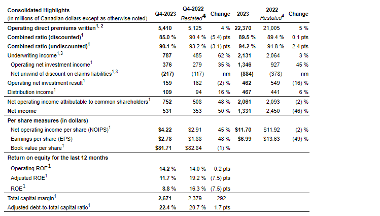 "The past year has been challenging for society, particularly in the face of numerous natural disasters. Through it all, our people worked relentlessly to ensure customers get back on track quickly. Despite shouldering elevated catastrophe losses as a result, the business demonstrated tremendous resilience. We achieved mid-teens operating ROE and maintained a strong balance sheet with $2.7-billion of total capital margin. As we look ahead to 2024, we are well positioned for outperformance, given strong top line momentum, continued underwriting discipline and a refocused UK&I segment. We are pleased to increase dividends to common shareholders for the 19th consecutive year."