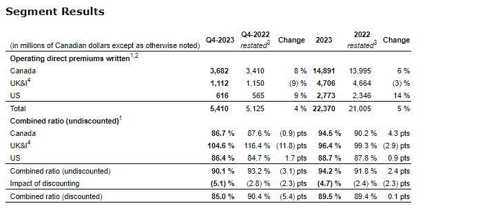 (4) On a pro forma basis (which excludes U.K. personal lines results) growth in constant currency was of 26 per cent for Q4 2023 and 7 per cent for 2023. Combined ratio was of 104.6 per cent for Q4 2023 (95.4 per cent in Q4 2022) and of 94.3 per cent for 2023 (89.7 per cent in 2022).