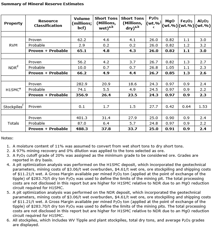 The Conda technical report includes mineral reserve estimates for RVM and H1/NDR, all of which are wholly owned by Itafos Conda. The mineral reserve estimates for these deposits were prepared by WSP, and this news release is the initial public disclosure of such mineral reserve estimates.