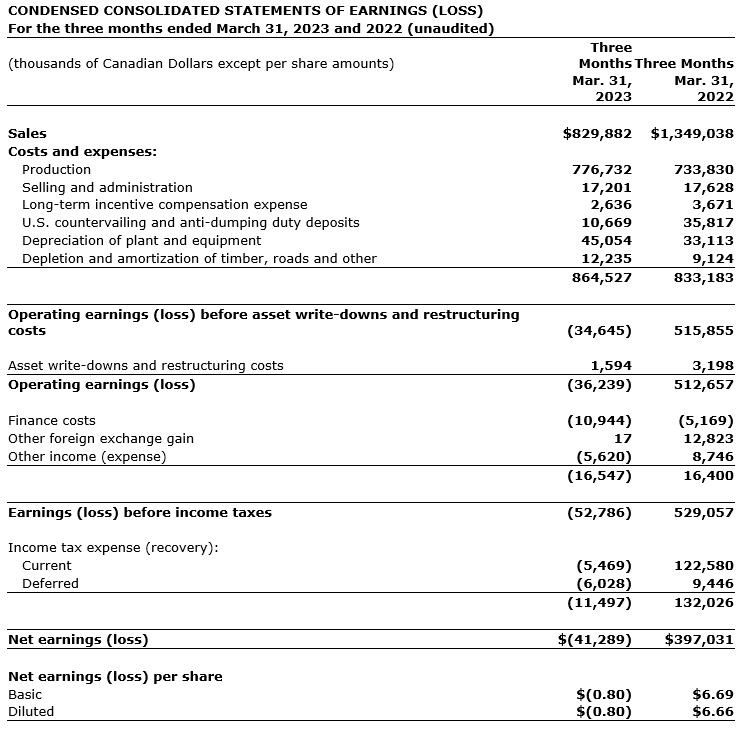 Interfor Corp. recorded a net loss in first quarter 2023 of $41.3-million, or 80 cents per share, compared with $72.2-million, or $1.40 per share, in fourth quarter 2022 and net earnings of $397.0-million, or $6.69 per share, in Q1 2022.