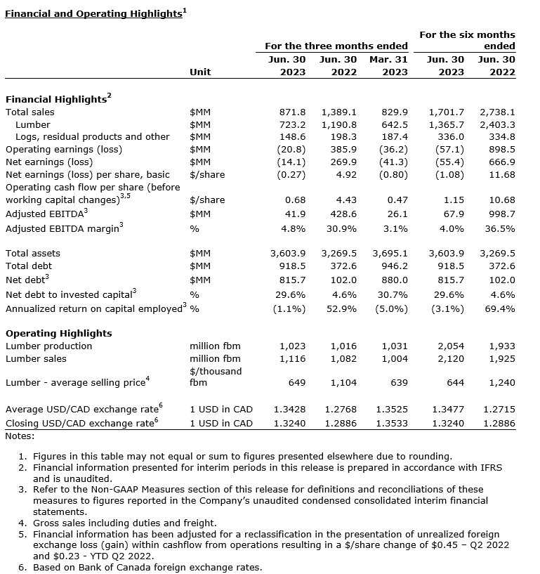 Interfor Corp. recorded a net loss in Q2 2023 of $14.1-million or 27 cents per share, compared with $41.3-million or 80 cents per share in Q1 2023 and net earnings of $269.9-million or $4.92 per share in Q2 2022.