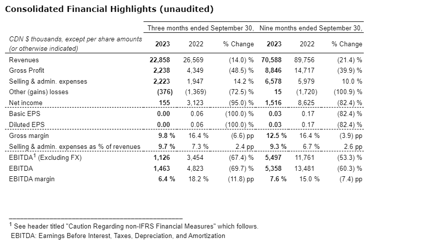 EBITDA came in at $1.5-million (6.4 per cent of sales) for the current quarter, down from $4.8-million (18.2 per cent of sales) in 2022. On a constant currency basis, EBITDA came in at $1.1-million (4.9 per cent of sales) for the current quarter, down from $3.5-million (13 per cent of sales) in 2022. For the first nine months of 2023, EBITDA stood at $5.4-million (7.6 per cent of sales) versus $13.5-million (15 per cent of sales) in the corresponding prior-year period. On a constant-currency basis, EBITDA came in at $5.5-million (7.8 per cent of sales) for 2023 year to date, compared with $11.8-million (13.1 per cent of sales) in 2022.