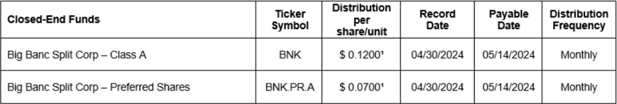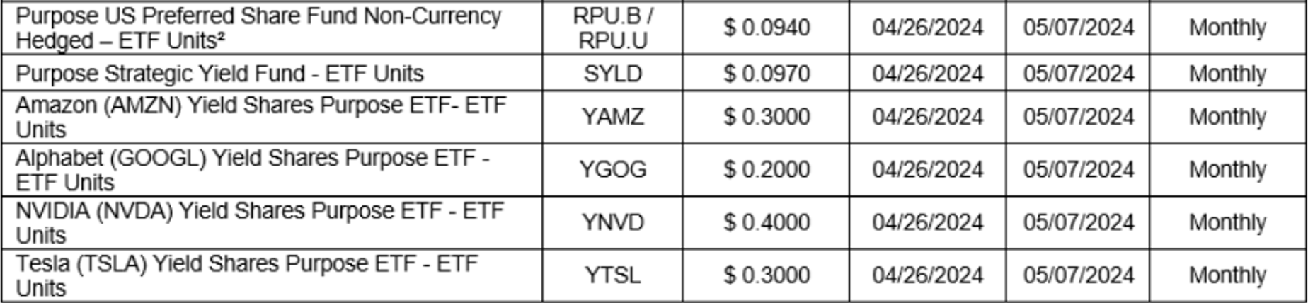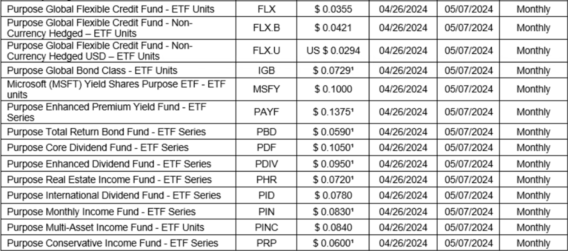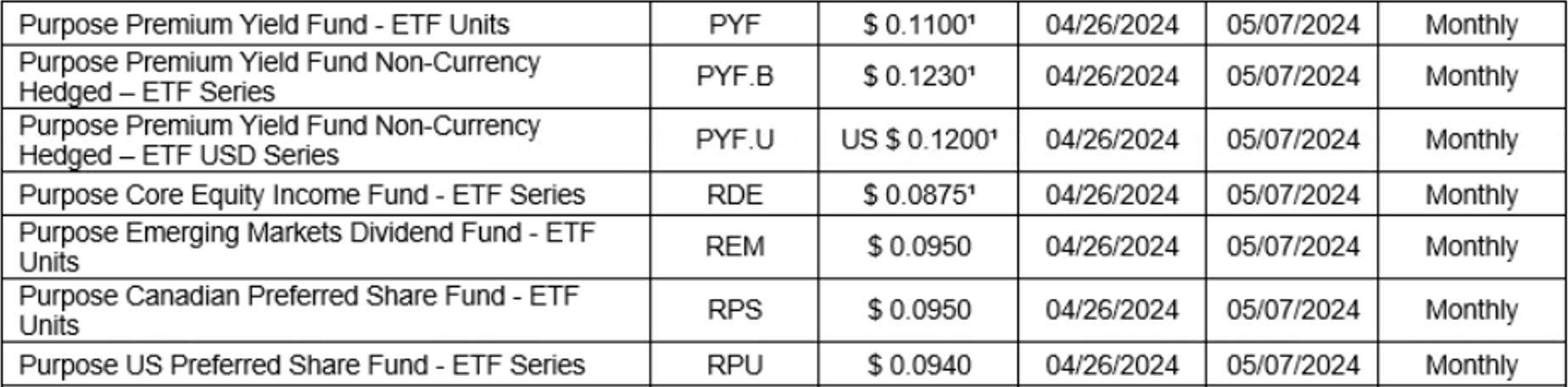 Purpose Investments Inc. has declared distributions for the month of April, 2024, for its