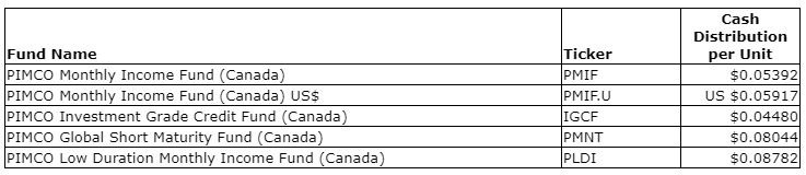PIMCO Canada Corp. has declared the July, 2023, cash distributions for the ETF (exchange-traded fund) series of the PIMCO Canada mutual funds that distribute monthly. Unitholders of record of the ETF series, at the close of business on July 24, 2023, will receive per-unit cash distribution payable on or about July 31, 2023.
