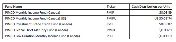 PIMCO Canada Corp. has declared the February, 2024, cash distributions for the ETF (exchange-traded fund) series of the PIMCO Canada mutual funds that distribute monthly. Unitholders of record of the ETF series, at the close of business on Feb. 22, 2024, will receive per-unit cash distribution payable on or about Feb. 29, 2024.